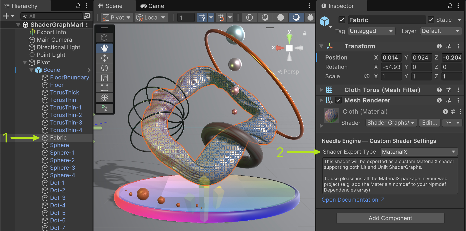 Enabling the MaterialX export type in the Shader Graph material properties.When you export your scene, all materials using shaders with the "MaterialX" export type will be embedded alongside your 3D content, and loaded at runtime.